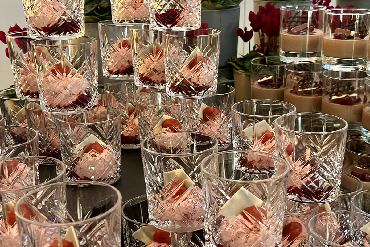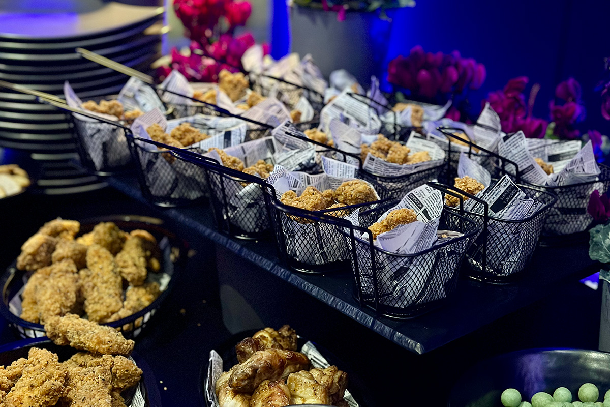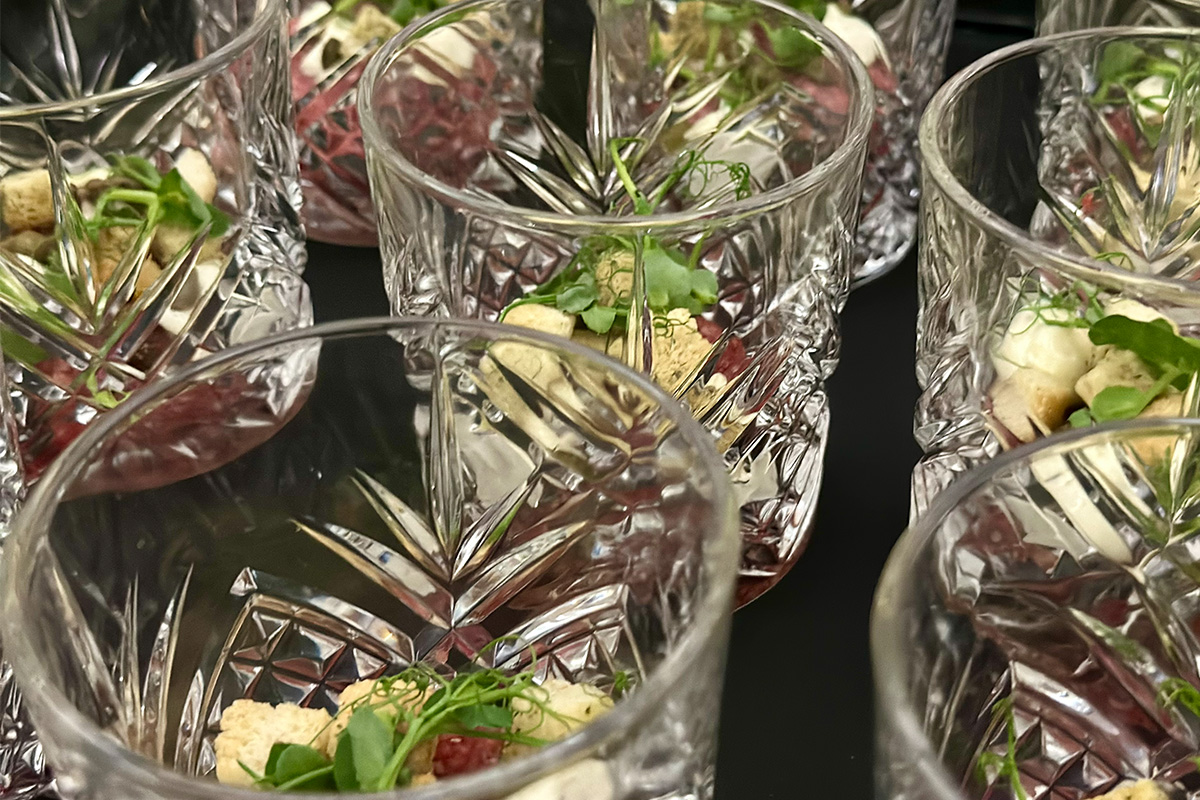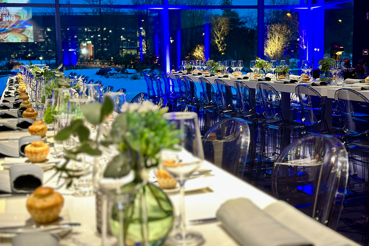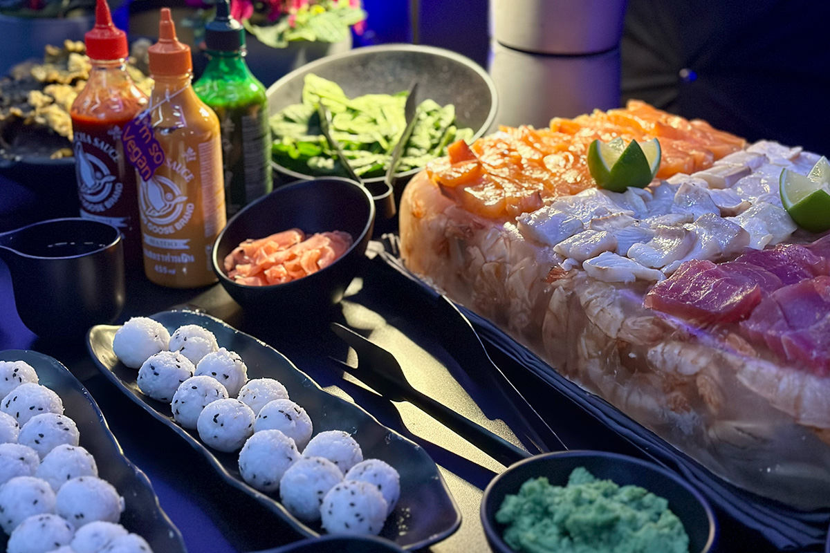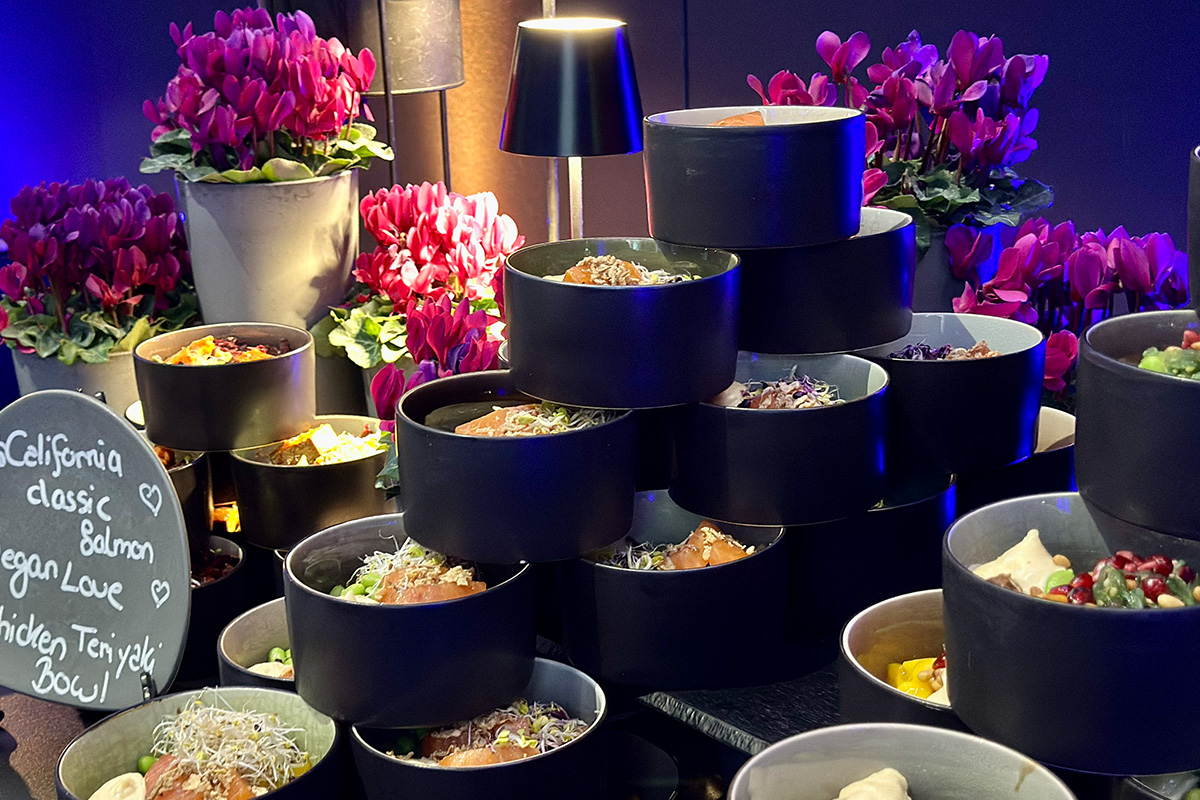 Im großen Saal wurde das Eventcatering weitergedacht. Interaktive Live-Stationen bildeten das Herzstück des Firmenevents: frisch geschnittene Sashimi-Spezialitäten vom Eisblock, urbane Bowl-Kreationen mit globalem Charakter sowie eine kreativ inszenierte „Seafood meets Chicken“-Station. Hochwertige Hauptgänge wie sous-vide gegartes Entrecôte und fein abgestimmte Fischkompositionen ergänzten das Konzept und verliehen dem Abend kulinarische Tiefe.
